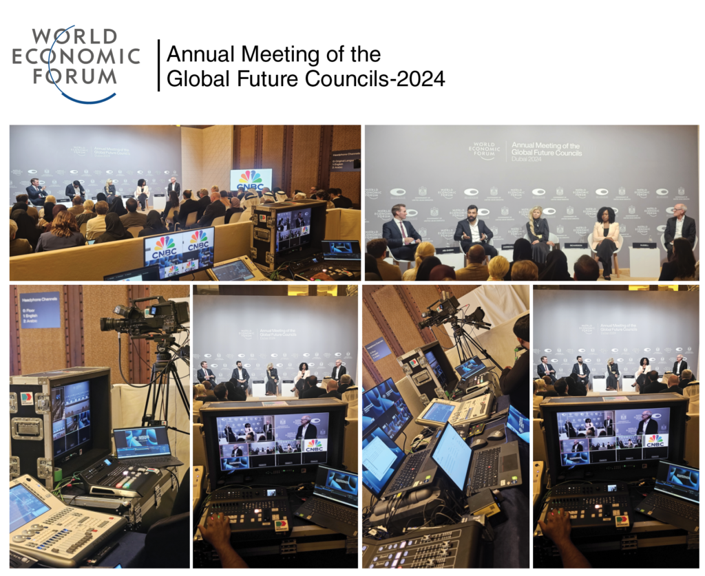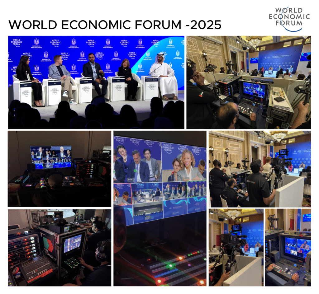 World Economic Forum, We delivered full Host Broadcast and Live Production services across two venues, ensuring flawless execution throughout. A 10-camera 4K setup, complemented by a PTZ camera for dynamic coverage, provided comprehensive visuals of the sessions, keynotes, and discussions. The production also featured real-time graphics integration for opening and closing of sessions, enhancing the live broadcast with visual overlays.