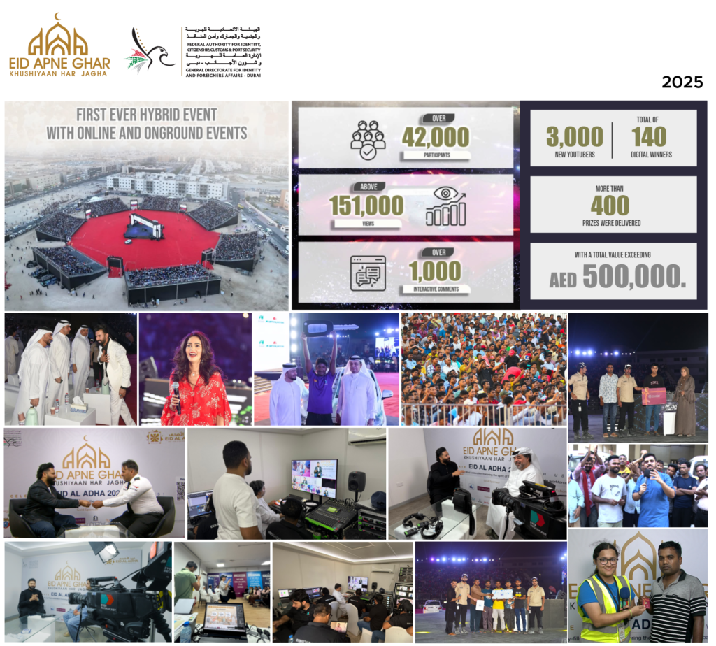 A hybrid broadcast event organized by GDRFA, where participants could win exciting prizes by simply registering their phone numbers. We managed studio broadcast and venue broadcast across four locations, with cameramen capturing live, authentic reactions of winners. A customized portal handled prize management through randomization. Continuous live interviews from different sites added to the excitement. The entire celebration was streamed live, offering an engaging and inclusive Eid experience to audiences across the UAE.