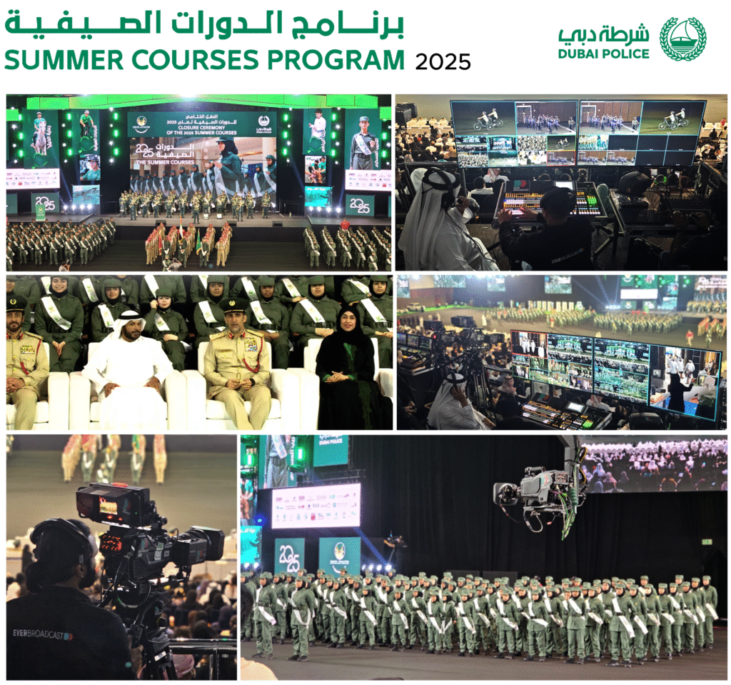 Ever Broadcast delivered full Host Broadcast for the Dubai Police Summer Graduation. Ensuring every proud moment of the ceremony was captured with impact and clarity. A 10 camera 4K setup, including a Jimmy Jib for sweeping cinematic shots of the audience and the parade, Including an Insta360 to showcase a wide behind-the-scenes perspective, brought the event to life in dynamic detail. To highlight the most memorable moments, 2 RF cameras were blend in to capture the kids ‘Parade’ in close range, preserving every step of discipline and pride. The result was a seamless production that honored the occasion with world class coverage and storytelling, all brought together under the vision of our Director, who chose the perfect frame for each act.